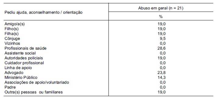 Por último, os inquiridos que pedem ajuda, aconselhamento ou orientação recorrem sobretudo aos profissionais de saúde (28,6%), ao advogado (23,8%), seguidos das autoridades policiais, dos filhos/filhas, amigos, outras pessoas ou familiares, todos com 19,0% (quadro 6).
