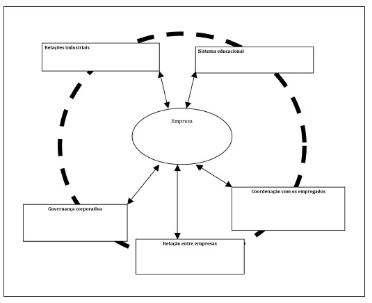 Analiticamente, o sistema institucional nacional foi dividido pelo VdC em cinco subsistemas principais: relações industriais, coordenação com os empregados, sistema educacional, relações entre as firmas e governança corporativa (Figura 1).