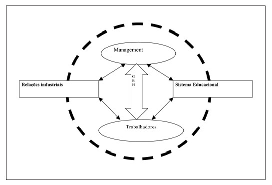 O modelo próprio das variedades de capitalismo será aprofundado nas suas dimensões mais importantes para a análise de dinâmicas intraorganizativas de GRH, ou seja, no âmbito das relações industriais e no sistema educacional. Colocam-se os trabalhadores como atores principais do modelo, além da empresa, representada nas filiais pelo management.
