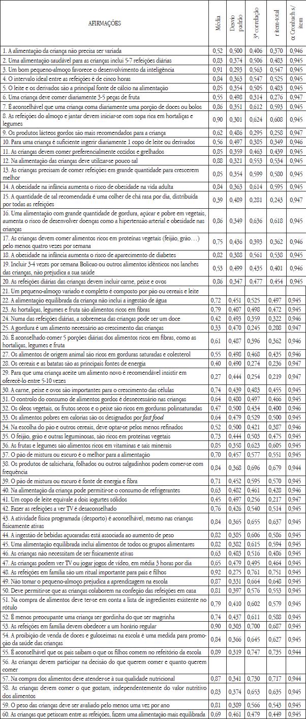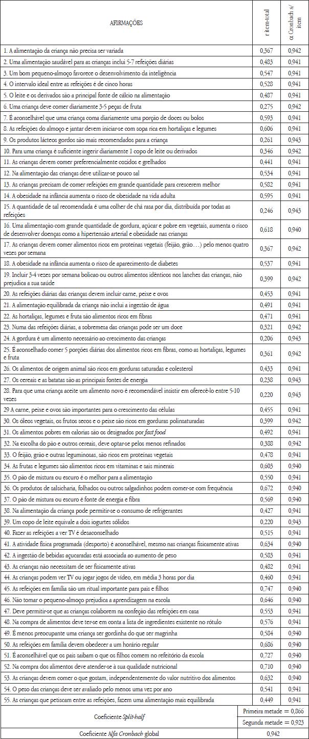 Verifica-se que os valores de correlação são todos superiores a 0,20, exceto os itens 21 e 56 que, face ao critério definido, foram eliminados respetivamente a partir da primeira correlação com a nota global. Para os restantes indicadores o valor mínimo obtido ocorreu no item 41 (r=0,254) Um copo de leite equivale a dois iogurtes sólidos e o máximo no item 48 (r= 0,759) As refeições em família são um ritual importante para pais e filhos.
