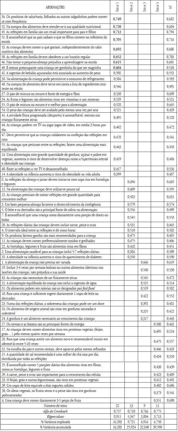 A organização dos itens pelos fatores permitiu atribuir os seguintes significados: fator 1 que designamos por Alimentação e Saúde satura em 22 itens (14, 16, 34, 35, 36, 37, 38, 40, 41, 42, 44, 45, 46, 47, 48, 49, 50, 51, 52, 53, 54 e 55), explicando 16,20% da variância total. O fator 2 que nomeámos de Regras Alimentares, é constituído por 13 itens, (2, 3, 4, 5, 7, 8, 9, 11, 12, 13, 18, 20 e 22), explicando 9,72% da variância total. O fator 3 designado por Crenças Alimentares Familiares é composto por 9 itens, (1, 10, 19, 21, 23, 24, 26, 31 e 43) e explica 6,91% da variância total. O fator 4, intitulado de Variedade/diversidade no Padrão Alimentar é composto por 11 itens (6, 15, 17, 25, 27, 28, 29, 30, 32, 33, 39), explicando 6,75% da variância total.