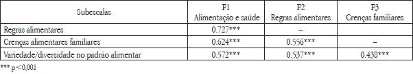 Efetuada uma matriz de correlação entre os fatores, estes registam correlações positivas e significativas, oscilando entre r= 0,727 (Regras Alimentares vs Alimentação e Saúde) e r= 0,438 (Variedade/diversidade no Padrão Alimentar vs Crenças Alimentares Familiares) o que indica boa correlação entre eles (c.f. tabela 4).