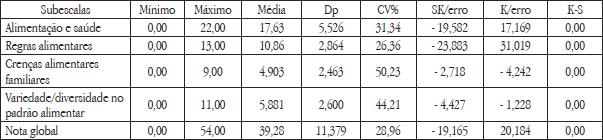 As estatísticas aos quatro fatores, revelaram valores mínimos de zero e máximos que oscilam entre 9,00 para o fator 3 Crenças Alimentares Familiares e 22,00 para o fator 1 Alimentação e Saúde. Os valores médios oscilam entre 4,903 (Dp=2,463) e 17,63 (Dp=5,526) nos fatores Crenças Alimentares Familiares e Alimentação e Saúde respetivamente. O coeficiente de variação (CV) indica dispersão moderada no fator Regras Alimentares e elevada nos restantes. O teste de normalidade de Kolmogorov-Smirnov (K-S), não segue uma distribuição normal para todos os fatores e os valores de SK/erro e K/erro indicam curvas assimétricas e placticúrticas, exceto nos F1, F2 e Fator global, que apresentam tendência leptocúrtica (c.f. tabela 5).