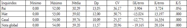 Analisando as estatísticas obtidas, verifica-se que o valor mínimo é para todos os respondentes de 0,00 e o máximo de 54 no casal. O valor médio é bastante semelhante nos três grupos com um desvio padrão que oscila entre 13,85 e 10,09. O teste de aderência à normalidade de K-S indica significância estatística, com exceção no grupo do pai (p> 0,05) (c.f. tabela 6).