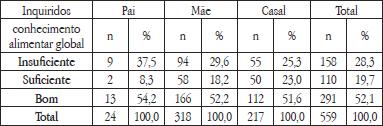 A análise do conhecimento dos pais em alimentação infantil assume particular importância no contexto da saúde infantil, dado o papel central da família no desenvolvimento do comportamento alimentar da prole. Assim, identificar as necessidades de (in)formação dos Pais nas atividades de educação e promoção da saúde infantil, sobretudo da educação alimentar deverá constituir um elemento básico ao seu planeamento.