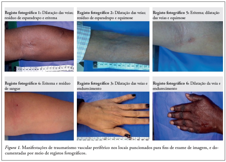 Figura 1. Manifestações de traumatismo vascular periférico nos locais puncionados para fins de exame de imagem, e documentadas por meio de registos fotográficos.