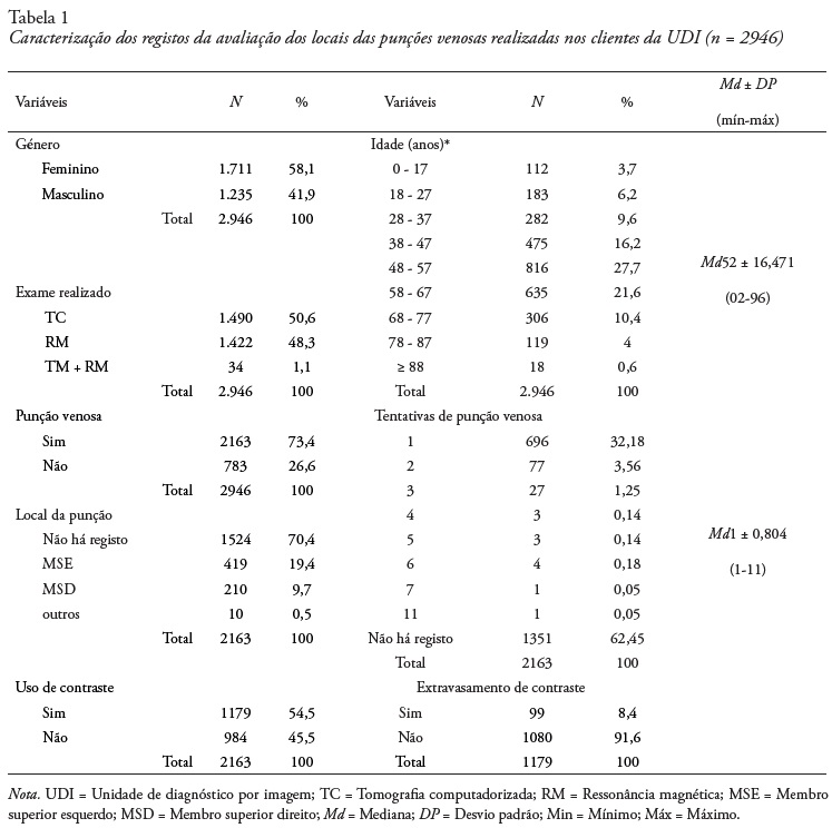 A coorte retrospetiva foi composta de 2.946 registos obtidos através das fichas de avaliação das punções venosas. A maioria dos participantes era do género feminino, com idade entre 48-57 anos e 58-67 anos (27,7% e 21,6%, respetivamente). O exame realizado com maior frequência foi a TC (50,6%). A punção venosa periférica foi realizada em 73,4% dos participantes, o principal local da punção foi o membro superior esquerdo (19,4%), com mediana de uma tentativa de punção venosa. Destaca-se que apesar de as punções terem sido realizadas em maioria no membro superior esquerdo (MSE), em 1.524 registos (70,4%) não havia registo referente ao local da punção. O contraste foi utilizado em 54,5% dos participantes. A incidência de extravasamento de contraste foi de 8,4% (Tabela 1).