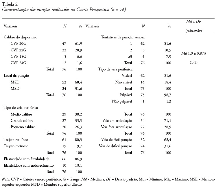 Na Tabela 2, apresenta-se a caracterização das punções de veias periféricas dos participantes na coorte prospetiva. Utilizou-se, com maior frequência, o cateter venoso periférico 20 gauge, com êxito na primeira tentativa de punção (81,6%), realizada, predominantemente, no membro superior esquerdo (68,4%). Em relação ao perfil da rede venosa dos participantes, 86,9% das veias foram classificadas como elásticas e com flexibilidade; 38,2% de médio calibre; 98,7% como palpáveis; 80,3% com trajeto retilíneo; 81,6% visíveis; 71,1% das veias foram puncionadas em articulação; e 68,4% das punções venosas foram consideradas fáceis. Cabe mencionar que não foi identificada nenhuma manifestação de traumatismo vascular do tipo infiltração/extravasamento durante o período de ocorrência da coorte prospetiva.