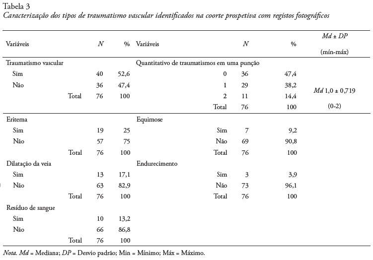 Apesar de não terem ocorrido casos de extravasamento de contraste durante a coorte prospectiva, foi possível identificar, com registos fotográficos, a presença de outros tipos de manifestações de traumatismo vascular decorrentes das punções venosas para a realização do exame (Tabela 3). A incidência de traumatismo vascular foi de 52,6%. As manifestações de traumatismo vascular identificadas e documentadas por meio de registo fotográfico, foram: eritema (25%), dilatação da veia (17,1%), resíduo de sangue (13,2%), equimose (9,2%) e endurecimento (3,9%). Foi encontrada pelo menos uma manifestação de traumatismo vascular em 38,2% dos locais de punção venosa periférica após remoção do CVP.