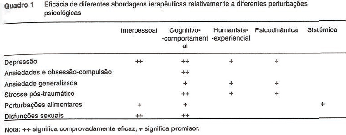 Com base em diferentes revisões da literatura é possível estabelecer o estatuto de eficácia de diferentes orientações teóricas relativamente a algumas perturbações particulares. A esquematização que, a seguir, se apresenta baseia-se em Beutler, BongareShurin (1998) e RotheFonagy (1996) (ver quadro 1).