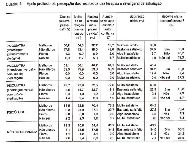 O questionário utilizado incluía um conjunto de perguntas relativas à percepção de melhoria associada à ajuda recebida, recorrendo a uma escala de cinco pontos (1= "melhorou em muito", 2 = "melhorou um pouco", 3 = "não mudou nada", 4 = "piorou um pouco", 5 = "piorou muito"). Também se perguntava a satisfação geral com o tratamento, através de escala com seis opções de resposta (de 1= "completamente satisfeito/a" a 6 = "completamente insatisfeito/ a)". Como se pode verificar no quadro 2, a grande maioria dos consumidores afirma ter melhorado e estar satisfeita com a ajuda psicológica recebida, quando a mesma implica terapia verbal. A intervenção apenas baseada em psicofármacos está associada a piores índices de melhoria percebida e de satisfação. 76,4% da amostra que fez psicoterapia com psicólogos afirma que recomendaria o profissional em causa a um amigo ou familiar; apenas 55% e 53,3% o fariam no caso do psiquiatra com abordagem essencialmente biológica e do médico de família, respectivamente. Estes resultados foram controlados no tocante ao tempo de terapia e à natureza e severidade das queixas no inicio da mesma (condição pré-tratamento — avaliação retrospectiva).