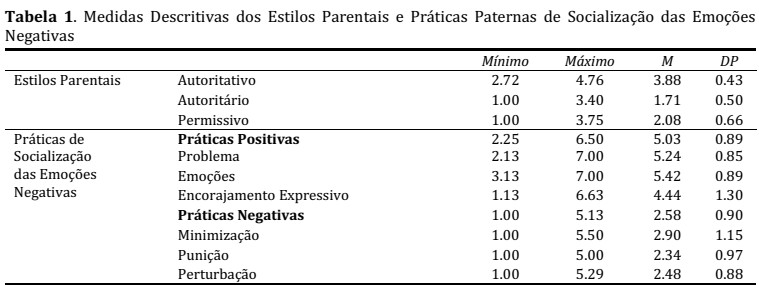 As medidas descritivas dos estilos parentais e práticas de socialização das emoções negativas do pai são apresentadas na Tabela 1. Refira-se que para os Estilos Parentais os valores teóricos variam entre 1 e 5, e para as Práticas de Socialização entre 1 e 7.