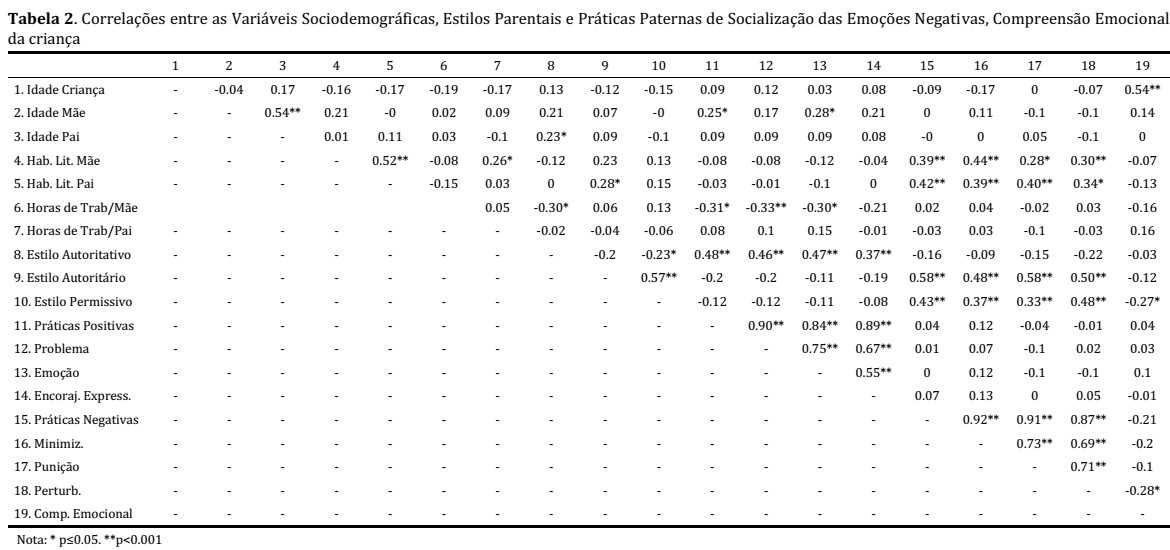 A maioria da investigação, realizada com mães, tende a indicar uma relação negativa entre estilo autoritário e práticas negativas com a compreensão emocional da criança em idade pré-escolar. No entanto, Guajardo e colaboradores (2009) não encontraram relação entre as demonstrações de raiva ou irritabilidade de ambos os pais e a compreensão emocional, sugerindo que estes comportamentos poderão afetar o desenvolvimento cognitivo da criança, mas não especificamente a compreensão das emoções. Também, para o estilo autoritativo e práticas de socialização positivas do pai não se encontraram associações com a compreensão emocional, indo ao encontro dos resultados obtidos por Niez e Alico (2015). Estes não encontraram associações entre os estilos parentais dos cuidadores (mãe/pai) e o desenvolvimento socioemocional da criança (que inclui a compreensão emocional), considerando que características como o temperamento da criança possam ter um maior impacto nestas competências.