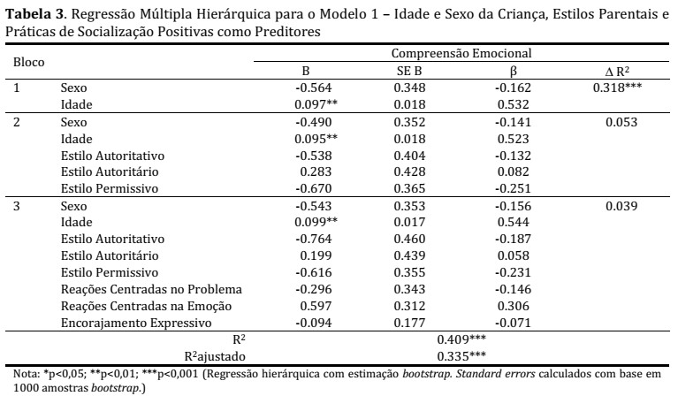 De seguida testaram-se dois modelos de regressão hierárquica, tendo a compreensão emocional da criança como variável dependente. No primeiro modelo entraram como preditores as variáveis independentes idade e sexo da criança (bloco 1), os estilos parentais autoritativo, autoritário e permissivo (bloco 2), e as práticas de socialização positivas, nomeadamente, reações centradas na emoção, no problema e de encorajamento expressivo (bloco 3). No segundo modelo mantiveram-se todas as variáveis, à exceção do bloco 3, que foi substituído pelas práticas de socialização negativas, especificamente, reações de minimização, punição e perturbação. Os valores VIF apresentaram-se todos abaixo de 5, o que indica não existirem problemas de multicolinearidade. Em ambos os modelos verificamos que a idade da criança é a única variável que permite predizer significativamente a compreensão emocional. Nas Tabelas 3 e 4 são apresentados os valores da regressão múltipla hierárquica para os dois modelos.