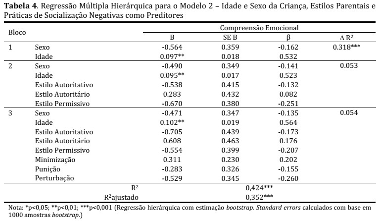 Por fim, procedeu-se à realização de dois modelos de regressão hierárquica tendo a compreensão emocional como variável dependente. No primeiro modelo entraram como preditores as variáveis independentes idade e sexo da criança (bloco 1), estilos parentais autoritativo, autoritário e permissivo (bloco 2) e as práticas de socialização positivas, nomeadamente, reações centradas na emoção, no problema e de encorajamento expressivo (bloco 3). No segundo modelo mantiveram-se todas as variáveis, à exceção do bloco 3, que foi substituído pelas práticas de socialização negativas, especificamente, reações de minimização, punição e perturbação. Considerando o tamanho da amostra em estudo, recorreu-se ao método de reamostragem Bootstrap com base em 1000 amostras, já que este tipo de métodos não exige que as distribuições sejam normais, nem que as amostras sejam grandes, permitindo fazer inferência e chegar a respostas mais precisas do que os métodos tradicionais nestas circunstâncias (Moore, McCabe, Duckworth, & Sclove, 2006).