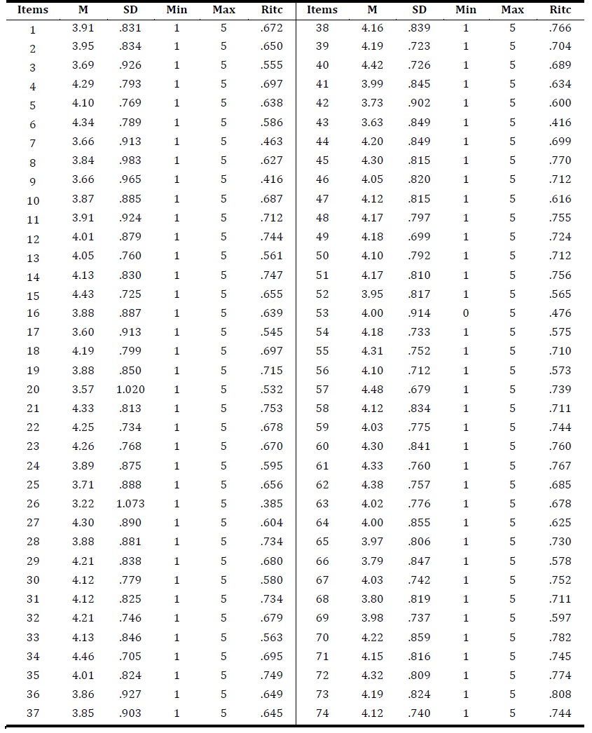 PCA was carried out with interaction and varimax rotation of the factors to obtain a clearer and more objective factorial solution (Brown, 2006). Six fundamental steps guided the data analysis as suggested by Kaiser-Meyer-Olkin (KMO): (a) factors with a value equal to or greater than 1 were retained; (b) items with eigenvalues equal to or greater than 0.35 were kept; (c) factors retained had to explain at least 40% of the variance; (d) the reliability factor had to be equal to or greater than 0.70 (Anastasi & Urbina, 2000); and (e) the factors had to be understandable or interpretable within the scope of the theory.