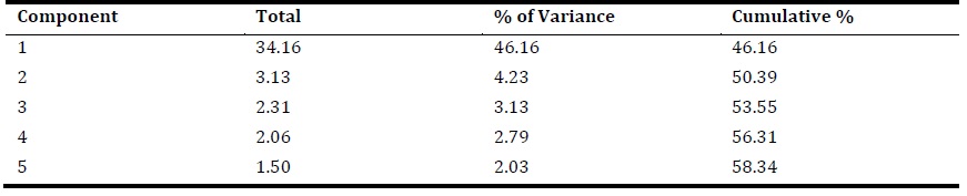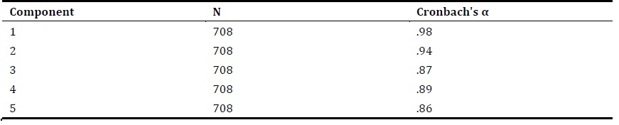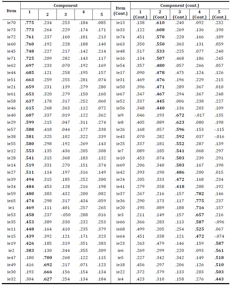 We began with an exploratory analysis based on eigenvalues higher than 1 and found an 8-factor solution explaining 63.12% of variance. The last 3 factors had 4 or fewer items, so it was decided to analyze PCA for 5 factors, as done in the original study (Nowack, 2004). The sample adequacy measure (KMO test =0.98) indicated that the analysis of the main components could be performed, and the sphericity test significance (35250.91; p <0.001) revealed that the items were interdependent. Table 2 presents the loadings by item and factor with loadings ranging from 0.383 to 0.775. Thus, a solution of five factors resulted in explaining 58.34% of total variance (see Table 3).
