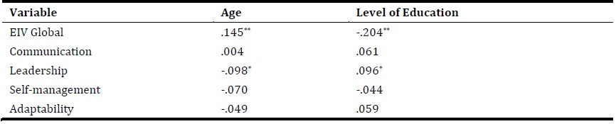 First, we looked at the correlation between EIV and personal and social variables, namely, age and level of education, and then we analyzed sex differences in EIV. Significant positive correlations appeared between global EIV and age, while negative ones arose between leadership and age. This suggests that older people have higher self-perceptions of EI but lower self-perceptions of leadership. The results also showed that global EIV decreases with higher education, while self-perception of leadership competencies grows (Table 5).