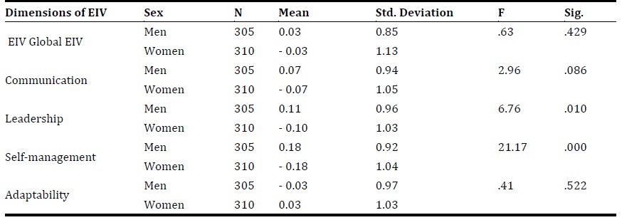 Finally, the analysis of sex differences (Table 6) across the five EIV scales revealed significant differences. Men’s self-ratings were significantly higher than women’s both for leadership (N=615; F(1,613)=6.76, p<.01) and self-management (N=615; F(1,613)=21.17, p<.).