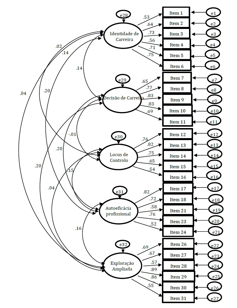 No que concerne à AFE, os resultados indicaram adequabilidade da amostra (KMO = .82) e que as correlações entre os itens eram suficientemente altas para se efetuar AFE, χ2 (351) = 1688.51, p < .001. Os resultados da PCA com rotação varimax permitiram identificar cinco eigenvalues cujos valores de Kaiser eram superiores a 1. Como apresentado na Tabela 1: o primeiro fator foi denominado exploração ampliada e inclui seis itens; o segundo fator foi denominado locus de controlo e inclui cinco itens; o terceiro fator foi denominado autoeficácia profissional e inclui cinco itens; o quarto fator foi denominado identidade de carreira e inclui seis itens; e o quinto fator foi denominado decisão de carreira e inclui cinco itens. A escala apresenta bons índices de precisão, apesar dos valores de VME para os três últimos fatores se encontrarem abaixo de .50 (Fornell & Larcker, 1981).