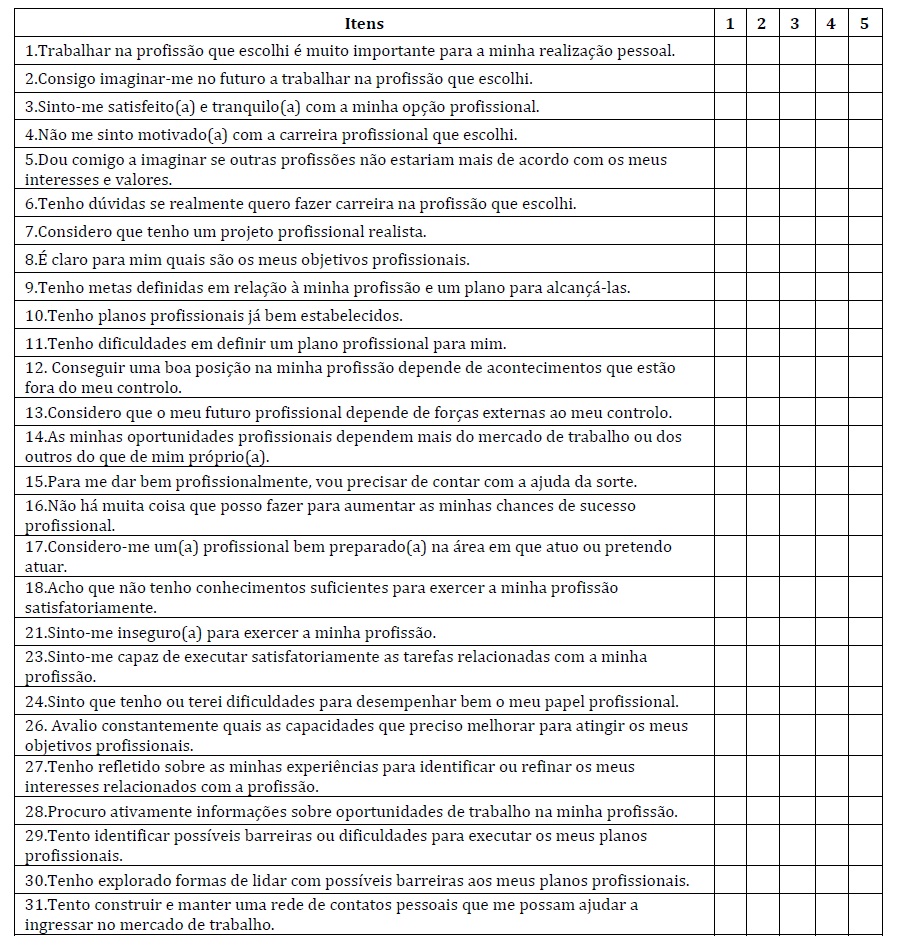 A Escala de Desenvolvimento de Carreira de Universitários (EDCU) de Teixeira e colaboradores (2019) é uma escala composta por um total de 31 itens distribuídos por cinco subescalas consistentes. No estudo original, a subescala identidade de carreira é avaliada com seis itens (e.g., Item 2 “Consigo imaginar-me no futuro a trabalhar na profissão que escolhi”). O locus de controlo com cinco itens (e.g., Item 15 “Para eu me dar bem profissionalmente, vou precisar de contar com a ajuda da sorte”). A autoeficácia profissional é avaliada com nove itens (e.g., Item 20 “Domino as capacidades necessárias para exercer a minha profissão eficazmente”). A decisão de carreira com cinco itens (e.g., Item 10 “Tenho planos profissionais já bem estabelecidos”). E, a exploração ampliada com seis itens (e.g., Item 26 “Avalio constantemente quais as capacidades que preciso melhorar para atingir os meus objetivos profissionais”). A escala apresenta itens invertidos, nomeadamente os itens quatro ao seis, na subescala de identidade de carreira; os itens 12 ao 16, na subescala de locus de controlo; o item 11 da subescala de decisão de carreira; e, os itens 18, 21 e 24 da subescala de autoeficácia profissional (ver anexo 1). A escala de respostas é do tipo Likert e varia de 1 (a frase é totalmente falsa a seu respeito) a 5 (a frase é totalmente verdadeira a seu respeito) pontos.