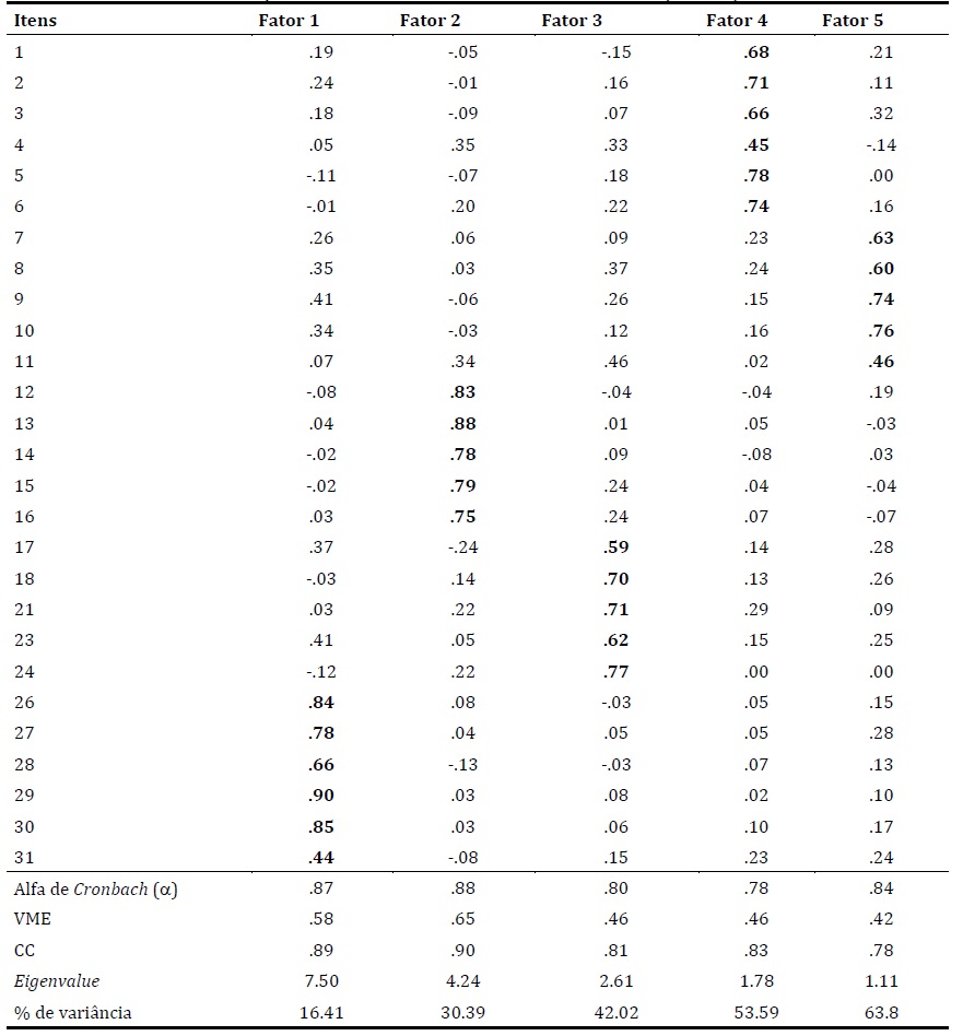 Nota. Os valores apresentados a negrito representam o fator principal onde o item satura. VME = Variância Média Extraída; CC = Confiabilidade Compósita
