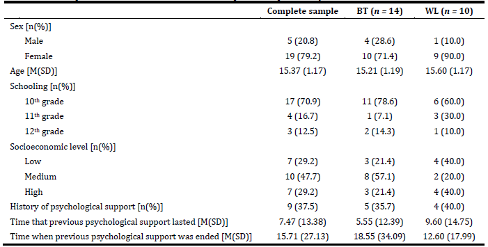 Participants were 24 adolescents with a primary diagnosis of SAD, aged 14 to 18 years old (see Table 1). They were randomly allocated into a Behavioral Therapy condition (BT; n = 14) or to a Waitlist condition (WL; n =10). Their sociodemographic characteristics were then compared. Participants in the BI and WL were equally prevalent by sex (ꭓ2(1) = 1.22, p = .27), schooling (ꭓ2(3) = 4.36, p = .23), socioeconomic level (ꭓ2(2) = 3.31, p = .19), and having previously received psychological support for their difficulties (ꭓ2(1) = 0.46, p = .83). They also had similar mean ages (z = -0.93, p = .40). Also, those who had a history of psychological support, had had it for a similar number of months (z = -0.21, p = .86) and that experience had been finished for a similar number of months (z = -0.67, p = .61).