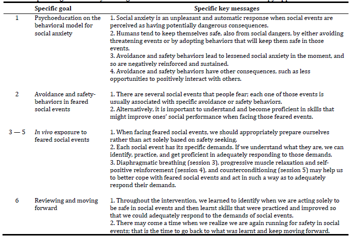 BT-SAD consisted of six weekly sessions delivered in person, each lasting approximately one hour. Each session consisted of two dynamics that were designed to accomplish specific goals and convey specific key messages (see Table 2). Sessions covered the following themes: psychoeducation of social anxiety as a fear response that is reinforced/ maintained by the practice of avoidance and safety behaviors (session 1); developing a fear hierarchy and discussing the avoidance and safety behaviors usually practiced in each feared situation (session 2); practice of social skills and adjustment of the practice of safety behaviors and then promotion of in vivo exposure to feared situations (sessions 3, 4 and 5); and finally reviewing contents, competences and how to continuously apply them (session 6). Sessions 3 through 5 included training in skills related to symptom management when performing behavior exposure (i.e., diaphragmatic breathing, progressive muscle relaxation, positive self-reinforcement) and in social skills training. The later was tailored to the specific demands of the events feared by members of each group. Trained social skills included: starting and maintaining conversations with others; expressing disagreement with another person’s opinion or with the way one is being treated by others; dealing with criticism from others; apologizing and/or asking for help; performing in front of others; and giving and receiving praise from others.