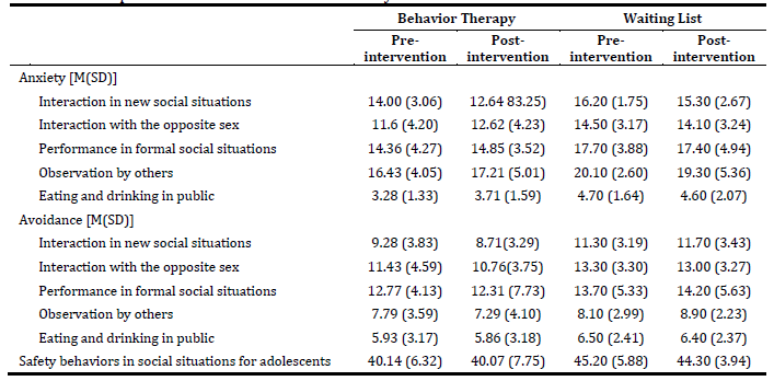 The Assertive Interaction measure was not used in the data analyses, due to it having achieved unacceptable internal consistency values. For the other measures, at least acceptable internal consistency values were found at pre- and post-intervention using the current sample: α ≥.68 for anxiety and α ≥.83 for avoidance of Interaction in New Social Situations; α ≥ .83 for anxiety and α ≥ .52 for avoidance of Interaction with the Opposite Sex; α ≥ .83 for anxiety and α ≥ .53 for avoidance of Performance of Formal Social Situations, α ≥ .57 for anxiety and α ≥ .67 for avoidance of Observation by Others, and α ≥ .70 for anxiety and α ≥ .67 for avoidance of Eating and Drinking in Public.