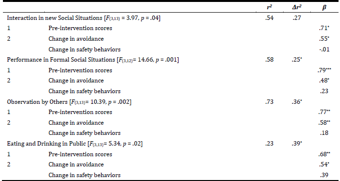 Hierarchical regression analyses were used to investigate variables predicting post-intervention social anxiety. Pre-intervention social anxiety was entered as a predictor in the first step, and the change in avoidance and in the practice of safety behaviors from pre- to post-intervention were entered as predictors in the second. A priori analysis using the Gpower software show that, for a sample of 14 participants using three predictors and power analyses set at .80, only large effect sizes would be found (i.e., > .35).