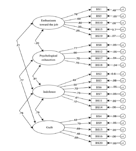 Regarding the item-total correlations, the values ranged from r = .21 to r = .53 in the enthusiasm toward the job dimension; r = .46 to r = .54 in the psychological exhaustion dimension; r = .11 to r = .49 in the indolence dimension and r = .32 to r = .48 in the guilt dimension. The enthusiasm toward the job dimension obtained an omega of .64; the psychological exhaustion dimension .79; the indolence dimension .80 and guilt .71. This is considered acceptable when the theoretical model is considered good (Hair et al. 2014) (Table 1).