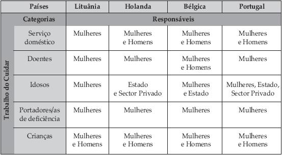 Uma leitura horizontal do quadro permite notar que existe partilha de tarefas do serviço doméstico em todos os países, menos na Lituânia, e que o trabalho do cuidar das pessoas doentes é exclusivo das mulheres, excepto na Bélgica, onde é partilhado com os homens. Relativamente ao cuidado com as pessoas idosas, referimos já a questão da Holanda, como caso de excepção. Nota-se ainda que, na Bélgica e em Portugal, quando estas permanecem no espaço da família, ficam a cargo das mulheres, embora existam algumas instituições do Estado, nestes dois países, que as podem receber, ou do sector privado, no caso de Portugal. Na Lituânia são as mulheres que assumem dominantemente essa tarefa. O acompanhamento de pessoas portadoras de deficiência, no espaço familiar, surge também, predominantemente, a cargo das mulheres. Numa nota positiva e promissora, relevando uma maior abertura dos homens ao mundo dos afectos, associada à emergência de novas formas de masculinidade, o trabalho do cuidar das crianças surge como única tarefa partilhada por mulheres e homens, nos quatro países.