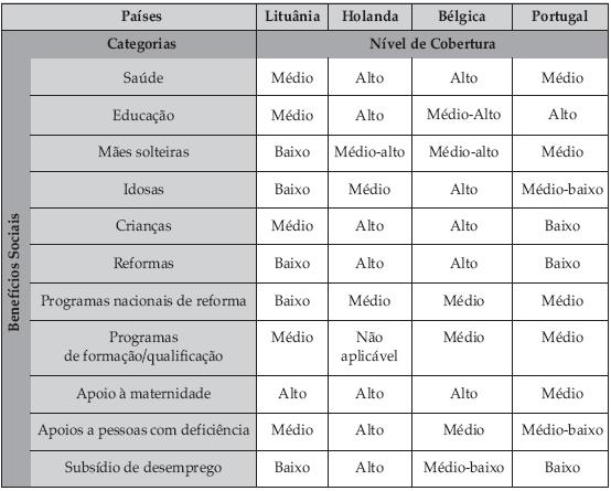 Uma leitura global das representações captadas neste quadro evidencia um nível de benefícios sociais mais elevado nos países centrais, sendo de relevar a não aplicabilidade dos programas de qualificação/formação na Holanda, dado o bom nível de qualificação geral das populações, mulheres e homens. Em Portugal, o nível alto é atribuído, pelas participantes, apenas à Educação, sendo os restantes itens classificados como médios, médio-baixos ou baixos. Nota-se também que o nível de cobertura dos benefícios sociais é classificado como baixo, na maior parte dos casos, na Lituânia, e apenas num nível elevado, no que concerne o apoio à maternidade.