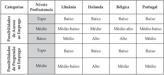 Uma leitura directa do quadro permite evidenciar algumas ideias fundamentais. Quanto ao acesso e progressão relativamente a posições de topo existe continuidade e semelhança nos quatro países, sendo as possibilidades para as mulheres a esse nível, baixas. Nota-se também que, conforme o nível profissional baixa, as possibilidades de acesso sobem de modo gradual, havendo maior amplitude no acesso, nos países centrais e menor nos países (semi)periféricos. Relativamente às possibilidades de progressão na carreira, existem maiores disparidades entre os quatro países. Enquanto na Lituânia e na Bélgica se mantém a tendência verificada na categoria acesso para o aumento das possibilidades de progressão, conforme o nível profissional baixa, na Holanda e em Portugal as possibilidades de progressão na carreira são baixas nos níveis de topo e nos níveis mais baixos, sendo significativamente maiores na Holanda, quando nos situamos num nível médio de profissionalidade. Em seguida, tentamos explicitar melhor estas similitudes e diferenças através da análise cruzada com dados estatísticos.