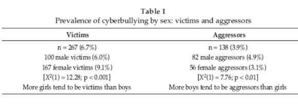 The results of our project showed that more adolescent girls were victims of cyberagression and more boys were perpetrators than girls. In addition, frequency of internet use correlated positively with the propensity to become a victim in the female sample and an aggressor in the male sample. In both groups, those who reported having been targeted by cyberaggression in the previous twelve months also tended to answer positively to the question of whether they had done the same to others during the same period. In our sample, being a cyberaggressor correlates positively with being a cybervictim for adolescent boys and girls. In both groups the reported frequency of internet use seemed to increase with age, and this variable correlated positively with the propensity to be either a victim or a perpetrator of cyberbullying amongst males, but not females. In the case of adolescent girls, the link to the possibility of becoming a cyberaggressor, but not a cybervictim increases as they get older.