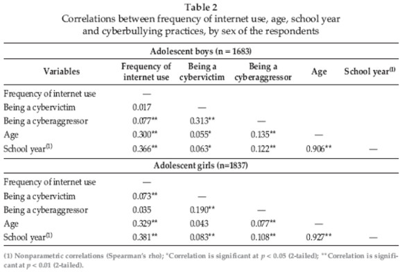 Considering the results for adolescent girls using the same variables, frequency of internet use correlated positively with the likelihood of being cyber-bullied (r = 0.073; p < 0.01), but not with becoming cyberaggressors (r = 0.035; p > 0.05). Like the boys, the female adolescents who stated they had suffered from cyberacts during the year prior to data collection tended to respond positively to the question of whether they had also been involved in cyberaggression directed towards others (r = 0.190; p < 0.01). Frequency of internet use seemed to increase with age (r = 0.329; p < 0.01) and this variable is positively related to the likelihood of girls becoming cyberaggressors (r = 0.077; p < 0.01), but not cybervictims (r = .043; p > 0.05). School year correlated positively with frequency of internet use (r = 0.381; p < 0.01) and the tendency of these girls to be either victims of acts of cyberbullying (r = 0.083; p < 0.01) or perpetrators (r = 0.108; p < 0.01).