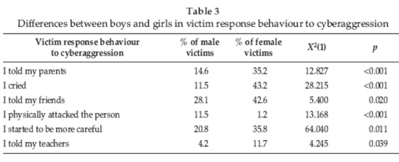 Among the behaviours displayed by both sexes after suffering cyberbullying, crying and talking about the problem with others were reported more by girls than by boys, with the former being more likely to share the information with their parents, teachers and friends. More female than male adolescents reported being more careful with their use of ICT after experiencing cyberaggression. In line with the aforementioned finding that the boys cited a desire for revenge after victimization more than the girls, they also scored significantly higher on the statement that they had physically attacked the perpetrators in response to cyberacts. When the aggressors of both sexes were asked to report their feelings after engaging in cyberbullying, more female adolescents admitted sentiments such as relief, insecurity, confusion and vulnerability than boys. The male aggressors did not admit to a wider range of other types of feelings. According to our data, the feelings ranked highest by both sexes were satisfaction, pleasure and indifference to what had happened.