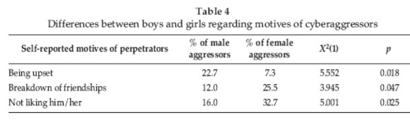 There were no differences between the male and female subgroups in terms of the channels of communication used to engage in cyberacts against others. The only difference between males and females found for aggressors was the use of e-mail for cyberbullying, which was reported significantly more by boys than by girls.