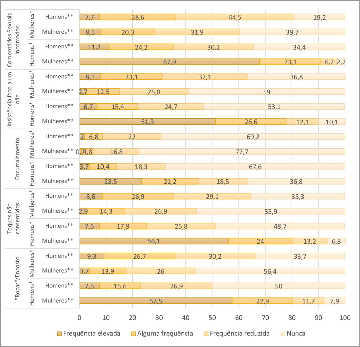 Este gráfico apresenta os comportamentos observados, a direção do comportamento (“homem para mulher”, “mulher para mulher”, “homem para homem”, “mulher para mulher”). O género do/a agressor/a; é representado por um asterisco (*) e o género da pessoa assediada por dois asteriscos (**).
