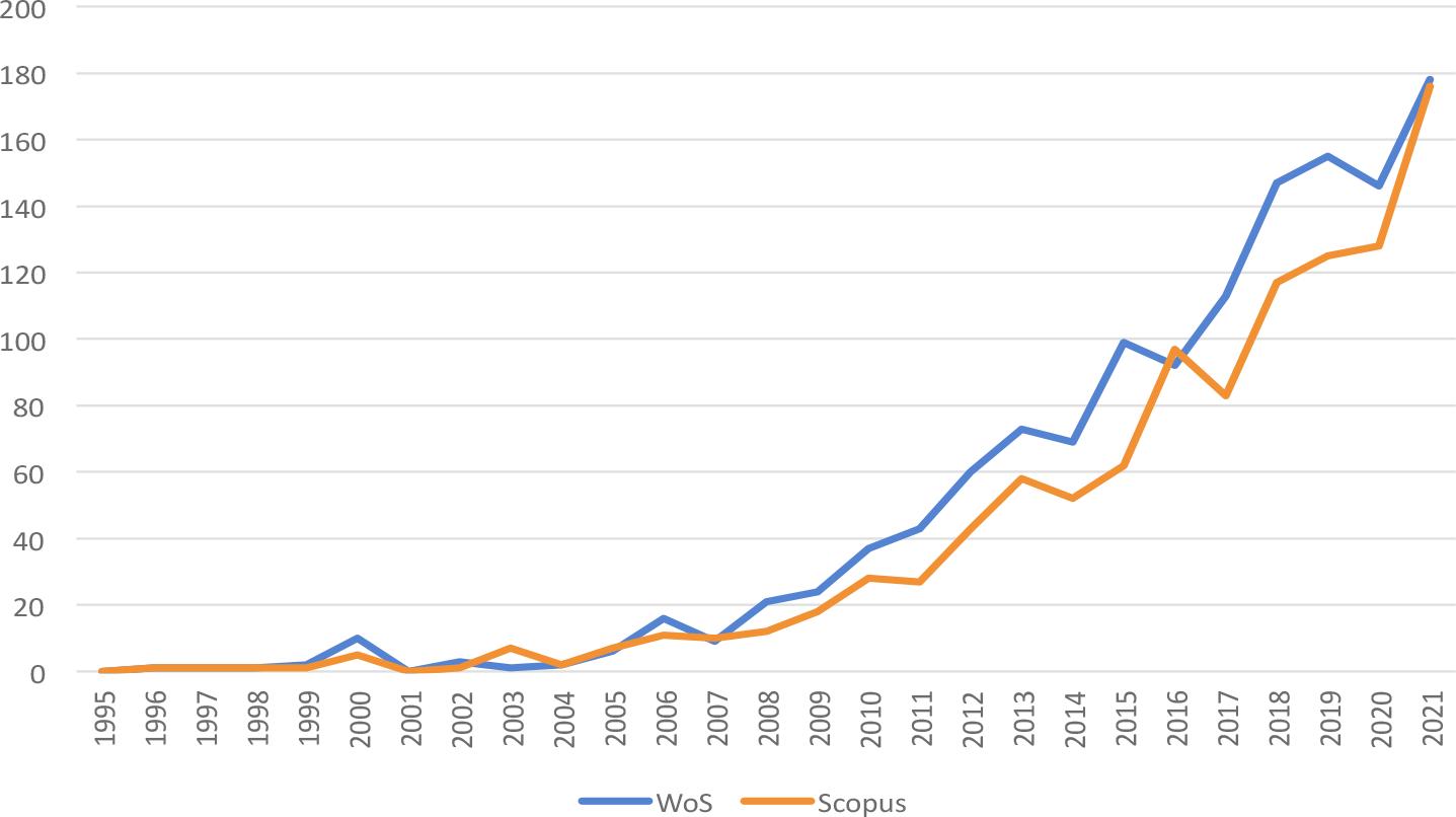 A definição do horizonte temporal da análise radicou no facto de que, a partir de 1995, na sequência da IV Conferência Mundial sobre as Mulheres e a publicação da Plataforma de Ação de Pequim (Nações Unidas 1995), a integração da perspetiva de género e a promoção da investigação sobre a temática tornaram-se partes integrantes das estratégias oficiais de promoção da igualdade entre mulheres e homens, tanto ao nível europeu como português. O lançamento do primeiro Plano Global para a Igualdade de Oportunidades em Portugal, em 1997, veio detalhar estas estratégias oficiais e estabelecer medidas transversais para promover a inclusão das questões de género no ensino e na investigação (Santos et al. 2023). Além disso, o ano de 1995 marcou a criação do primeiro programa conferente de grau em Estudos sobre as Mulheres no país (Mestrado em Estudos sobre as Mulheres na Universidade Aberta). Uma vez que as plataformas de indexação bibliográfica tendem a apresentar alguma demora na inclusão de novos registos, a produção científica referente a 2021 pode não estar toda na nossa base de trabalho.
