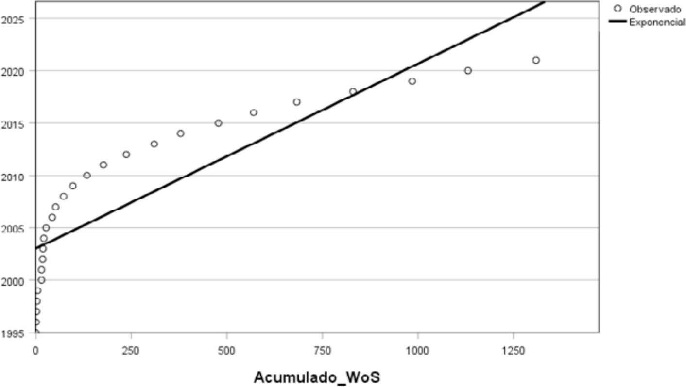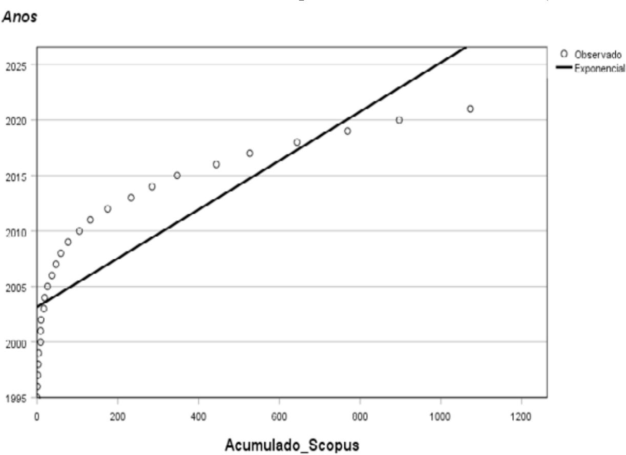 No sentido de aferir se os dados registados se ajustam a um modelo exponencial recorreu-se à análise de regressão de estimação de curva (ver Gráficos 2 e 3). Com coeficientes de regressão (R2) expressivos (respetivamente, 0.722 e de 0.737) e valores de probabilidade significativos (p<0.001) para ambas as bases de dados, os resultados fortalecem a conclusão de que o modelo exponencial é uma representação sólida do crescimento observado nas publicações entre 1995 e 2021. Essa modelagem explica uma percentagem significativa da variação (respetivamente, cerca de 72% e 74%), sugerindo uma trajetória exponencial consistente com o aumento das publicações ao longo do período analisado.