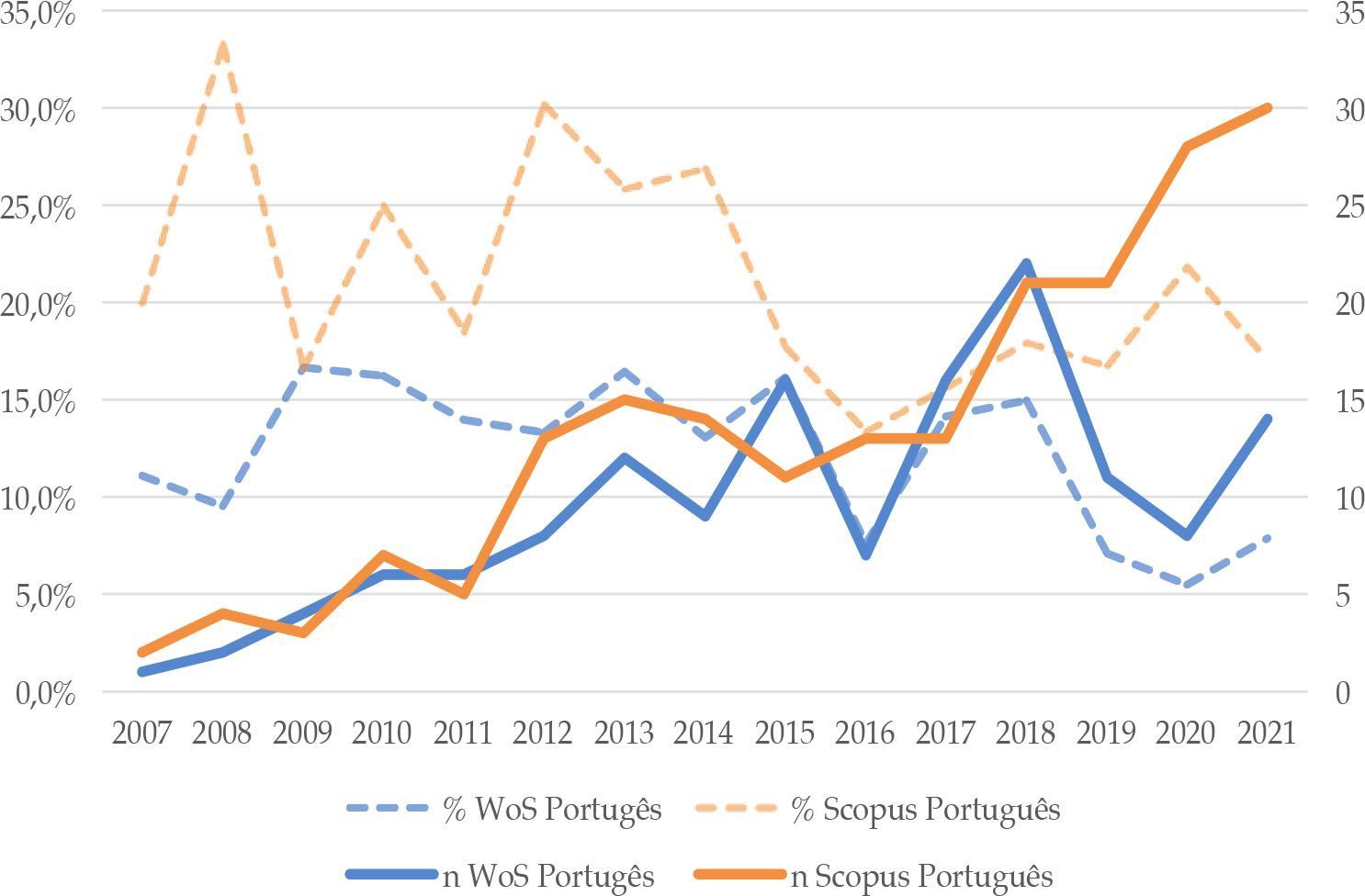 Observamos uma clara predominância da língua inglesa em ambas as bases de dados, seguida, com uma representação muito menor, da portuguesa. Como mostra a Tabela 2, os resultados da WoS revelam uma presença reduzida de publicações em português, sendo praticamente metade da observada na Scopus (10,8% na WoS vs. 20% na Scopus). Tal resultado alinha-se com estudos anteriores, que constataram uma maior tendência da WoS para a indexação de publicações em inglês (Vera-Baceta et al. 2019). Apesar deste viés da WoS, importa ressaltar que as publicações portuguesas em EMGF foram redigidas em sete idiomas diferentes (inglês, português, espanhol, francês, italiano, galego e coreano), ao passo que os registos na Scopus abrangem apenas cinco idiomas (inglês, português, espanhol, francês, italiano).