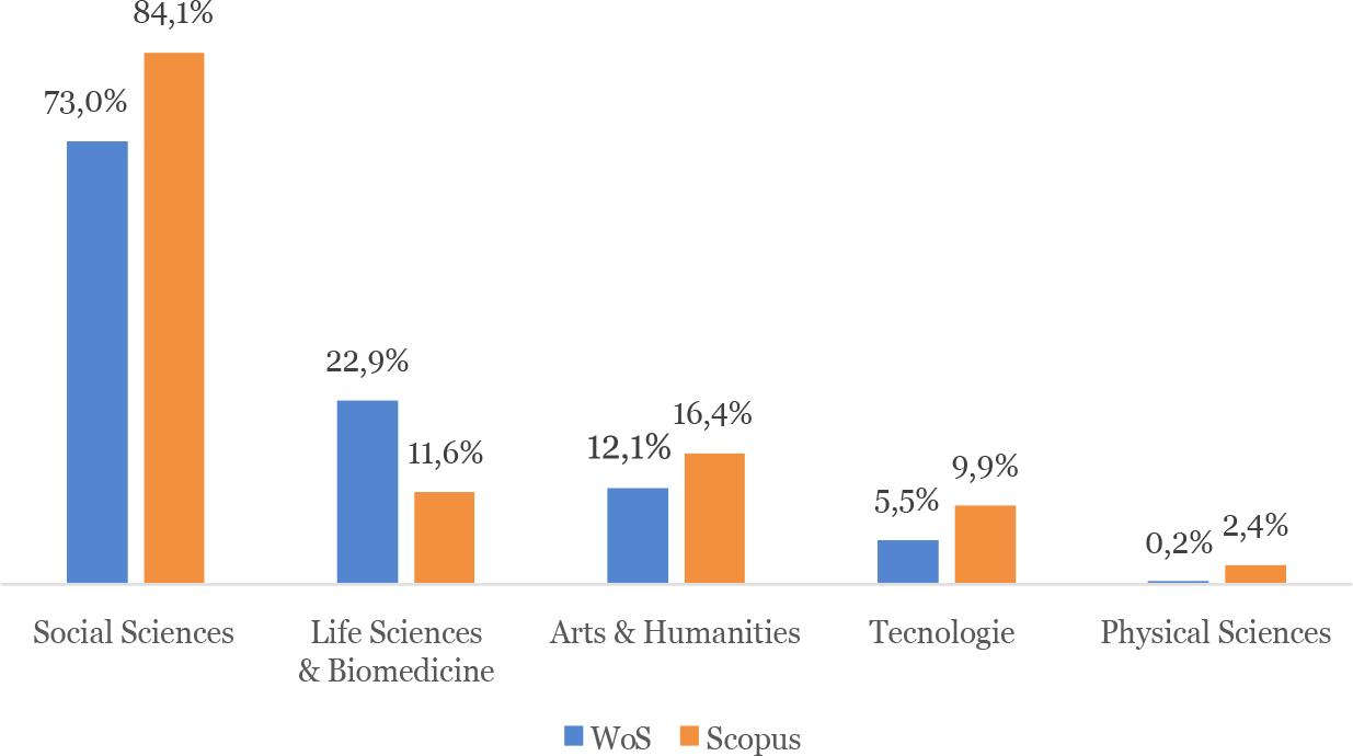 No que toca à cobertura das diferentes áreas do conhecimento, diversos estudos têm mostrado que, apesar do viés das duas plataformas a favor das ciências naturais, engenharias e biomedicina, a Scopus apresenta maior cobertura que a WoS em todas as grandes áreas de investigação (Mongeon e Paul-Hus 2016; Huang et al. 2020). Além disso, outras análises sugerem que a base de dados da Elsevier tem especial vantagem sobre a WoS no que respeita à cobertura das ciências sociais e humanidades (Norris e Oppenheim 2007; Pranckute 2021). Ao analisarem a produção científica eslovena publicada em ambas as bases, Bartol et al. (2014) constataram que a Scopus liderava em número de documentos e citações em todos os campos de investigação, em especial nas áreas das ciências sociais e humanidades. Um cenário semelhante foi identificado por Archambault e Larivière (2010), na sua análise da produção canadiana.