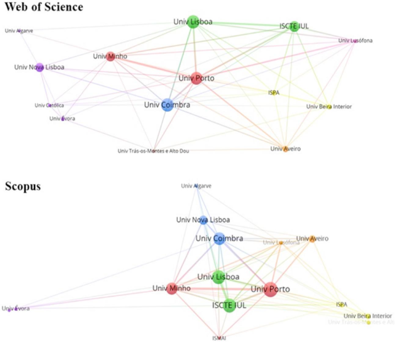A análise das redes de colaboração na WoS identificou oito diferentes clusters, sendo o maior composto por quatro instituições e o menor por uma: (1) o verde reúne a Universidade de Lisboa e o ISCTE; (2) o vermelho, a Universidade do Porto e a Universidade do Minho; (3) o roxo é constituído pela Universidade do Algarve, Universidade Nova de Lisboa, Universidade de Évora e Universidade Católica Portuguesa; (4) o laranja mostra o isolamento da Universidade de Aveiro; (5) o rosa, o da Universidade Lusófona; (6) o amarelo associa a Universidade da Beira Interior e o ISPA; (7) o castanho e (8) o azul evidenciam o isolamento, respetivamente, da Universidade de Trás-os-Montes e Alto Douro e da Universidade de Coimbra.