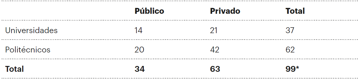 Tabela 1. Distribuição de Instituições do Ensino Superior por setor e subsistema de ensino *Valor global inclui duas instituições universitárias de tipo público militar e policial.