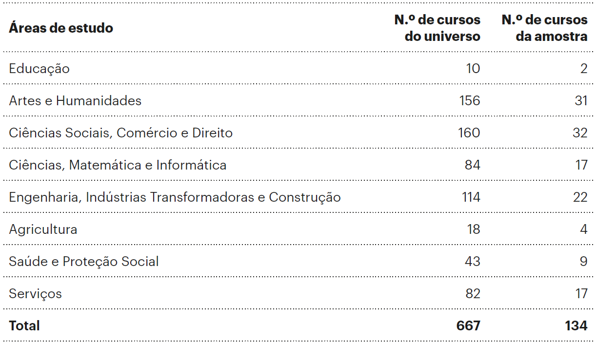 Do total de 667 cursos listados no índice de cursos da DGES, selecionámos 134, escolhendo o equivalente a 20% de cada área formativa. Na tabela que se segue apresenta-se a distribuição de cursos no universo e na amostra.