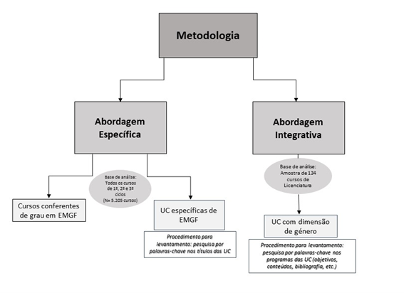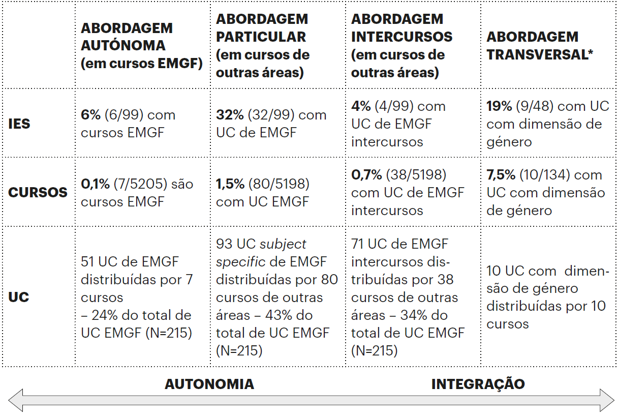 No nosso estudo, a análise da integração dos EMGF nos currículos das IES em Portugal atenta a estas duas perspetivas, mobilizando uma dupla abordagem que combina o mapeamento de programas de estudo e UC específicas de EMGF (abordagem autónoma/específica) com a integração de questões de género nos programas das disciplinas estabelecidas (abordagem integrativa).