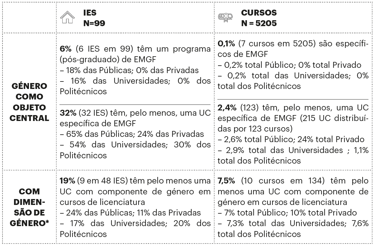 Vemos que, de um modo geral, o género não faz parte do conhecimento usualmente proposto pelas instituições de ensino superior em Portugal. Agregando as diversas abordagens à integração dos EMGF consideradas (Quadro 1), verificamos que apenas cerca de um terço das instituições (35 em 99) integra algum curso (6 em 99 = 6%). É mais ou menos da mesma ordem a prevalência de unidades curriculares (32 em 99 = 32%), enquanto, no que respeita aos conteúdos, a sua presença não ultrapassa um quinto (9 em 48 = 19%).