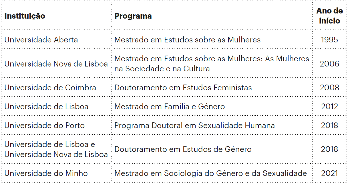 Embora não se conheçam análises nacionais ou transnacionais que apresentem dados quantitativos sobre o alcance da oferta formativa específica e/ou com componente de género no sistema de ensino superior, os estudos comparativos de nível europeu de larga escala do início do século colocam Portugal numa posição de relativa desvantagem a este nível (a par de outros países do Sul e Leste europeu) (Braidotti & Vonk, 2000; Griffin, 2005). Estes dados não serão alheios às especificidades dos percursos do campo no contexto português, nomeadamente o difícil e complexo processo de institucionalização dos EMGF em Portugal até 2000 (Ferreira et al., 2001, 2002; Ferreira, 2001; Ramalho, 2001, 2009). Enquanto noutros países proliferaram projetos de investigação em EMGF e a criação de numerosos cursos e departamentos/centros de investigação nesta área a partir dos anos 1970, Portugal iniciou este percurso mais tarde, a partir do início da década de 1990 (Augusto et al., 2018; Amâncio, 2003).