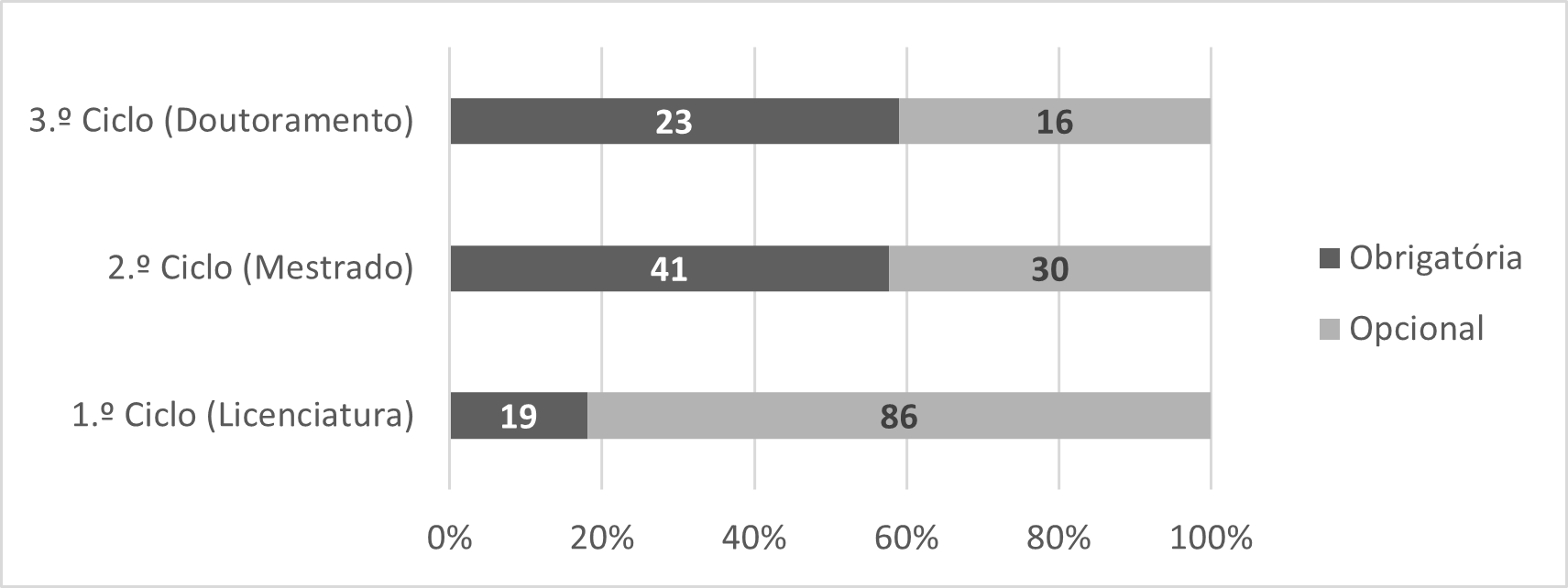Coerentemente, como se vê na figura 2, o caráter opcional da oferta curricular específica em estudos de género é prevalecente nas Licenciaturas (81,9%), enquanto nos Mestrados e Doutoramentos é tendencialmente obrigatório (em 58,2% das UC).